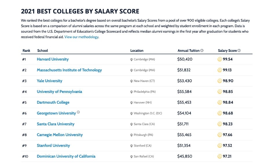 Each school then receives an overall Salary Score by degree level to illustrate colleges that prepare students for a high paying career regardless of major. This overall score is based on how well the school performs across all the programs it offers, weighted by student enrollment in each program.
