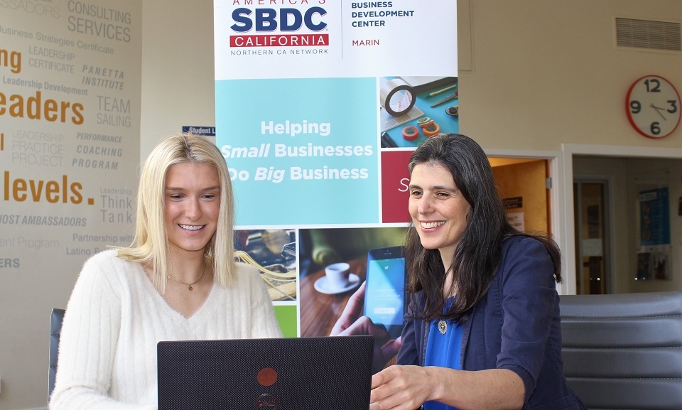 Photo above of MBA student and intern Riley Friauf (left) sitting with Marin SBDC director Miriam Hope Karell.