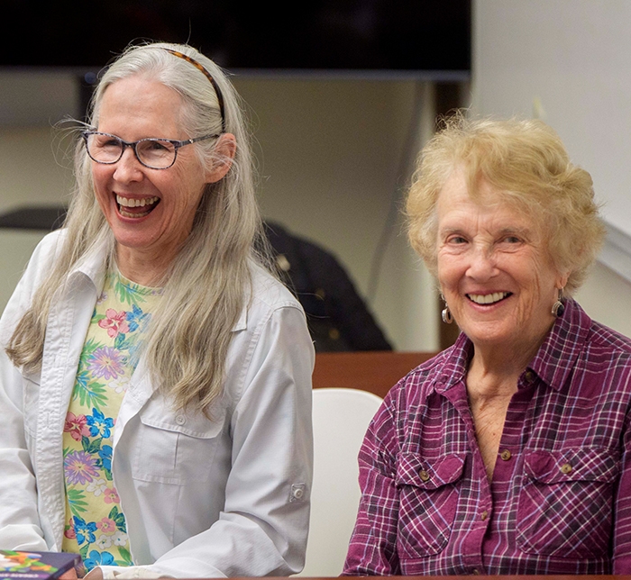 two OLLI members smiling while in a classroom