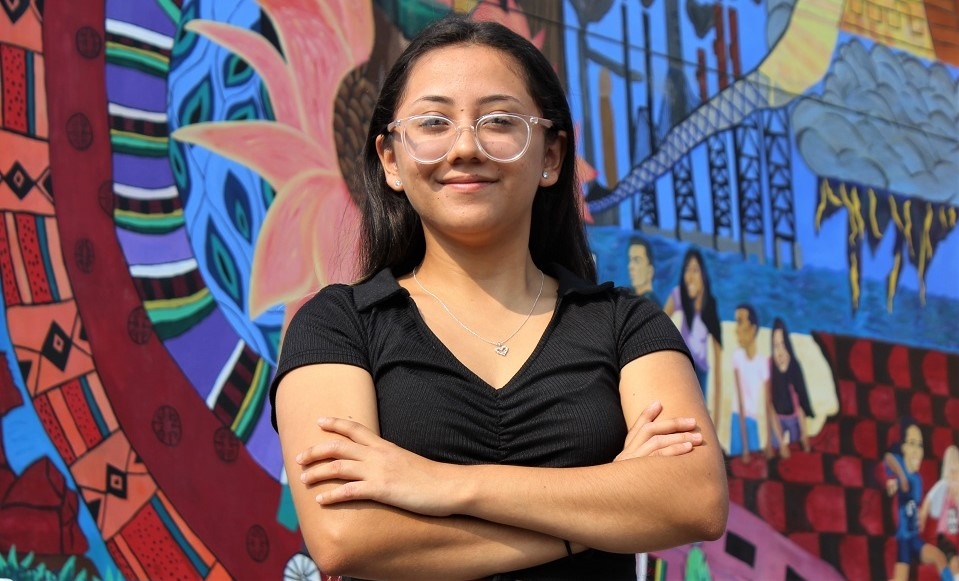 Photo of Britney Gutierrez Calderon '24 posing in front of wall mural outside Canal Alliance