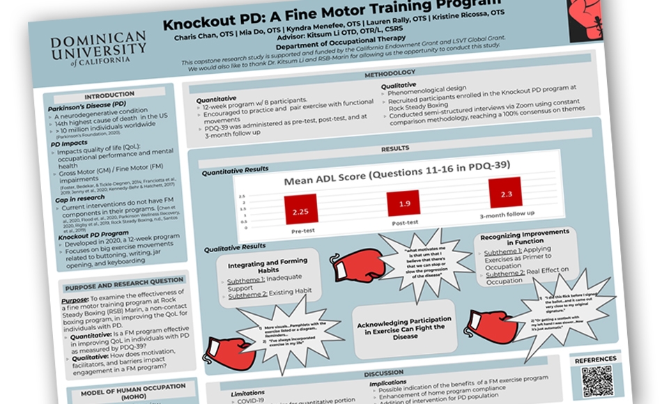 Graduate students in Dominican University of California’s Occupational Therapy program have developed a fine motor skills training program that draws on exercises often used by boxers in order to help people living with Parkinson’s Disease (PD) carry out simple – yet essential – tasks that become difficult as the disease progresses. Preliminary results show the program significantly improves the ability of PD patients to carry out tasks such as buttoning shirts and writing.