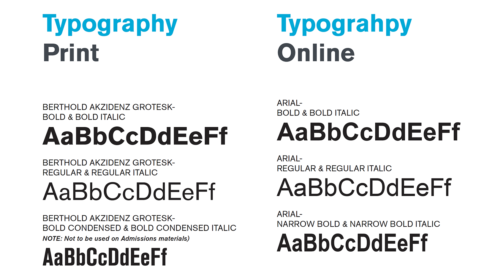 Berthold Akzidenz Grotesk is the University's primary typeface for print. When Berthold is not available, please use Futura, Arial, or a sans-serif typeface.